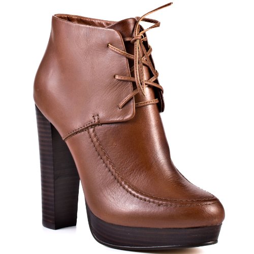 Channel a vintage look into your wardrobe with these Kelsi Dagger booties. Evonna features a saddle leather upper with a partial lace up closure. Seam details add an extra touch to this style and is completed by a 4 3/4 inch stacked heel and 1 inch platform.